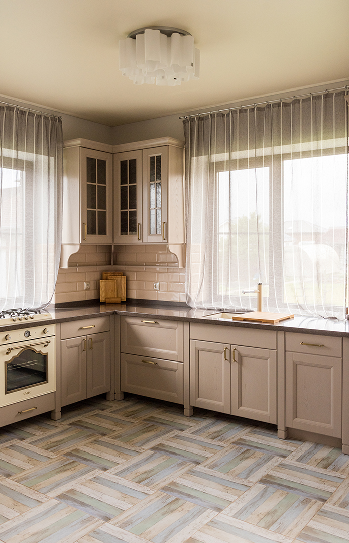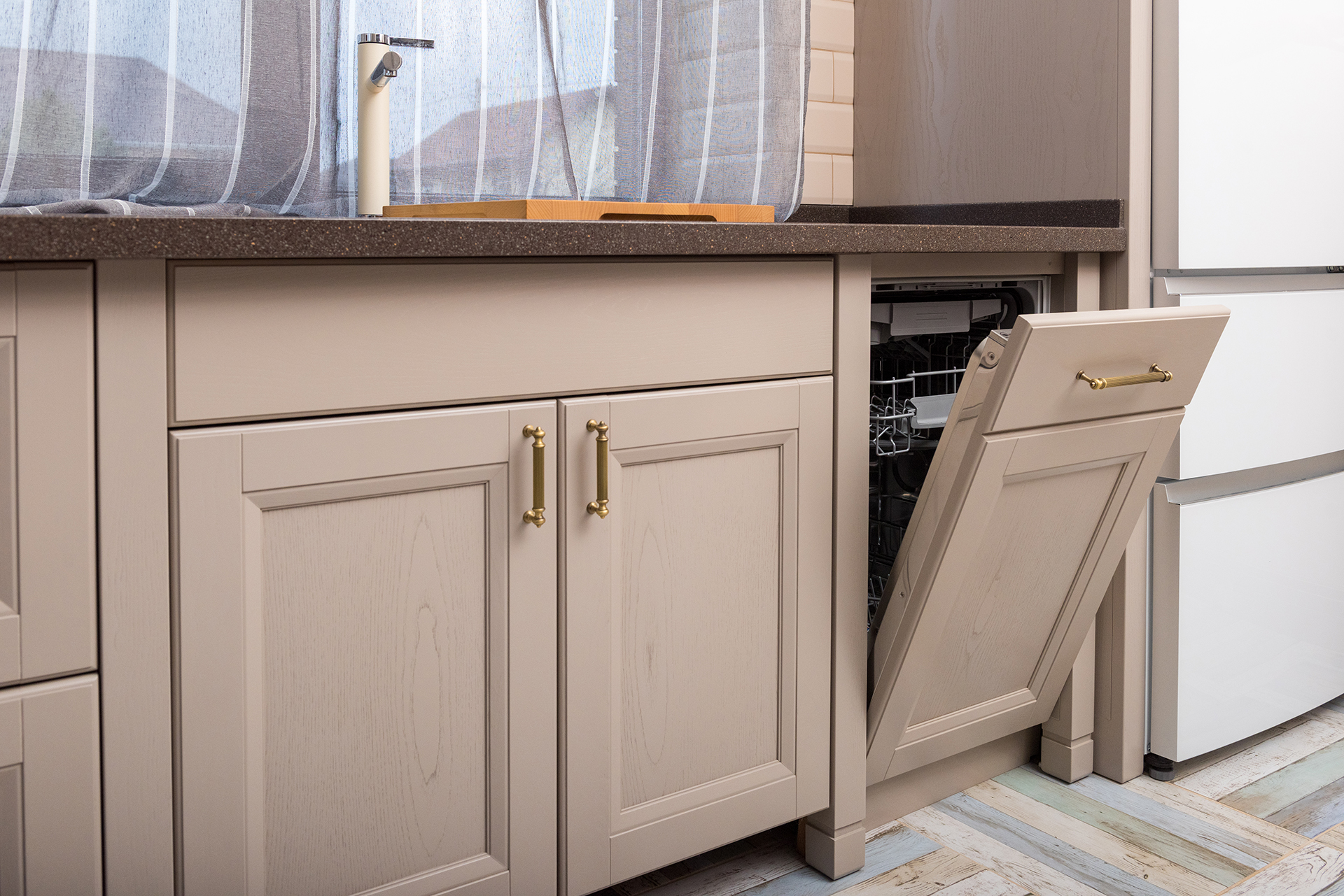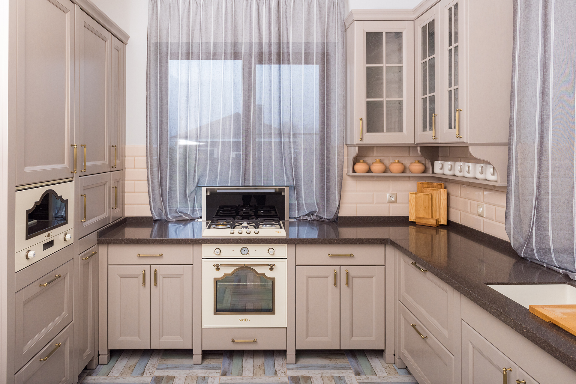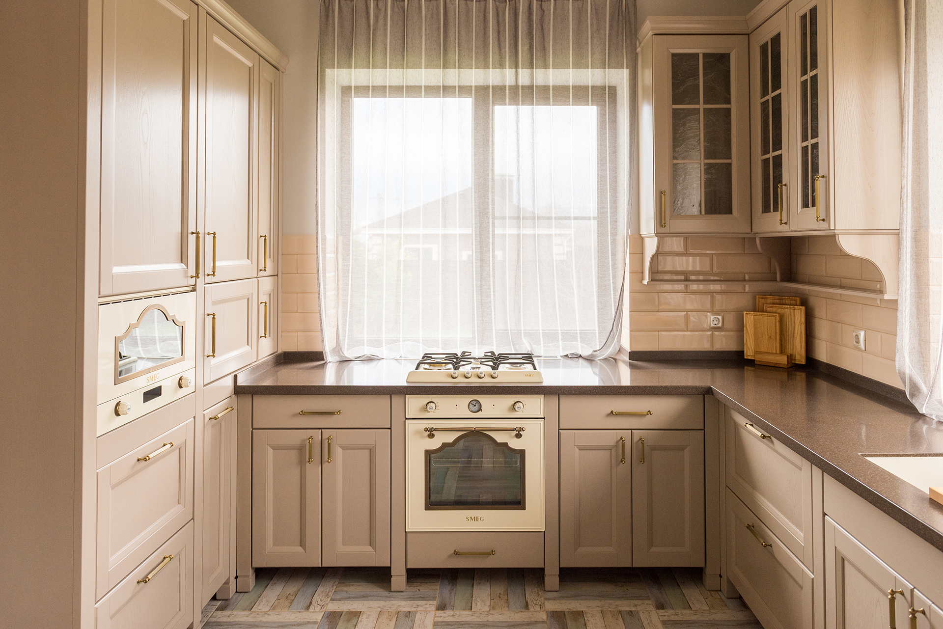 П-образная кухня с фасадами из массива ясеня в эмали, оснащена всей современной техникой и фурнитурой, выдвижная бутылочница, вытяжка, встроенная в столешницу, встроенная посудомоечная машина и т.д.