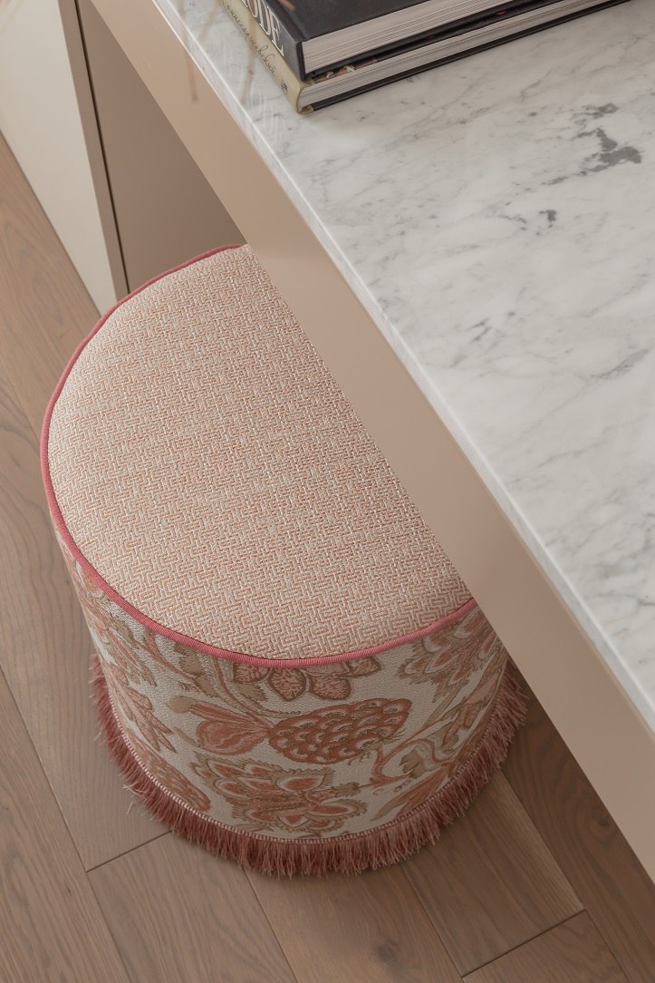 Большой встроенный гардеробный шкаф с имитацией арочной филёнки и ручками из натурального мрамора.