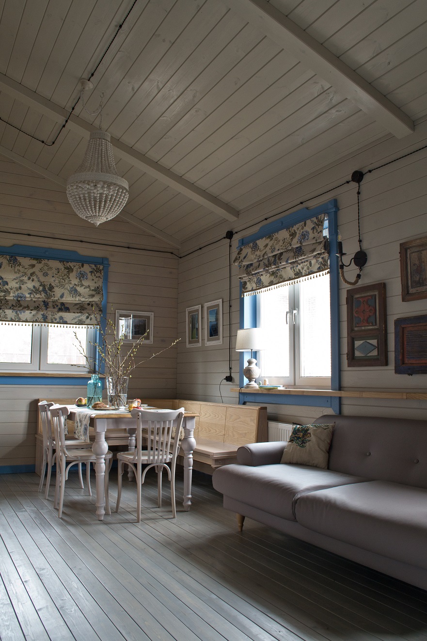 Стол с фигурными ножками и деревянный диванчик из массива ясеня, покрытые лаком, сохраняющим текстуру дерева. Удобное место отдыха после бани.