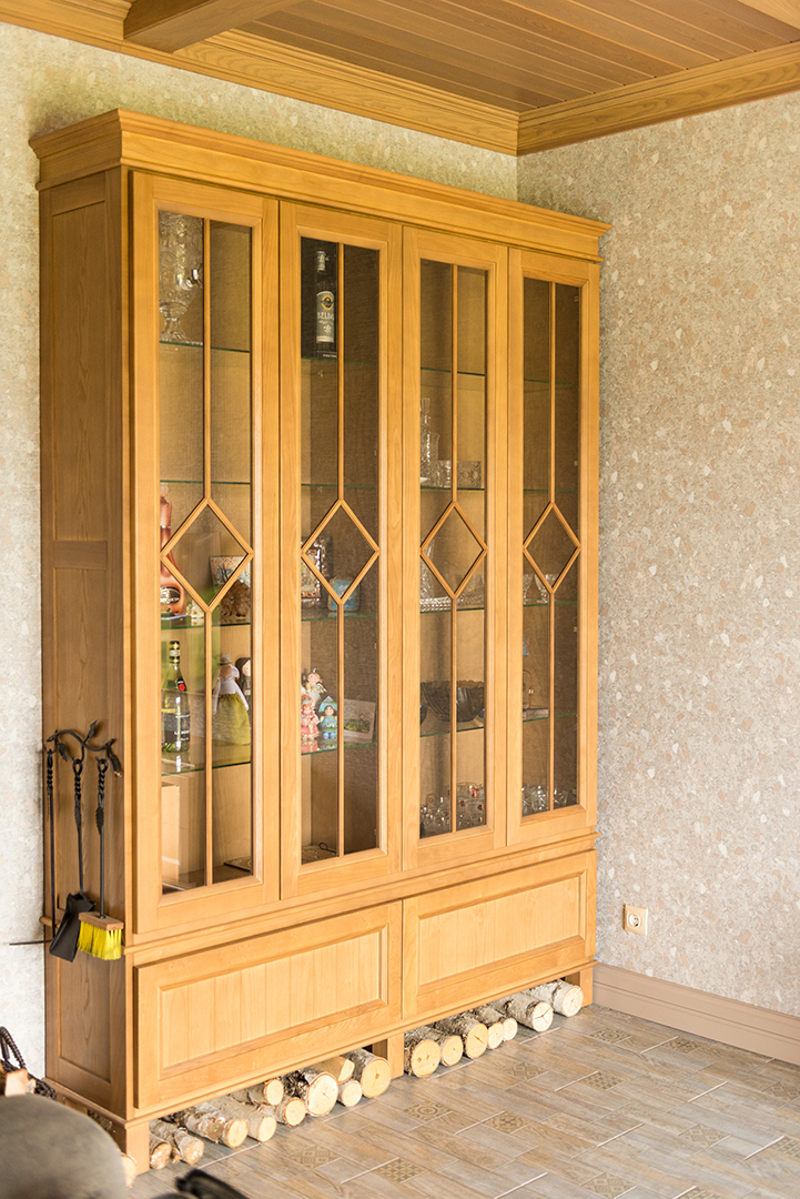 Фигурная фрезеровка на фасадах тумбы повторяет раскладку стекол на дверках книжного шкафа. Теплый цвет дерева с тумбы переходит на деревянный кессонный потолок.